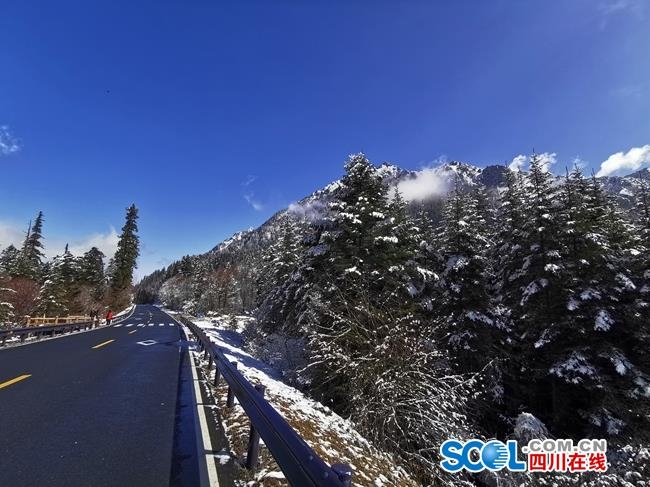 栈道上,景区管理局的几名工作人员正在扫雪。一位工作人员告诉记者,这里海拔相对较高,雪是在昨晚下的,大约有四五公分厚,也算是给开园来的首批游客一个特别的惊喜。“但今天阳光非常好,随着气温升高,雪也会很快融化。”