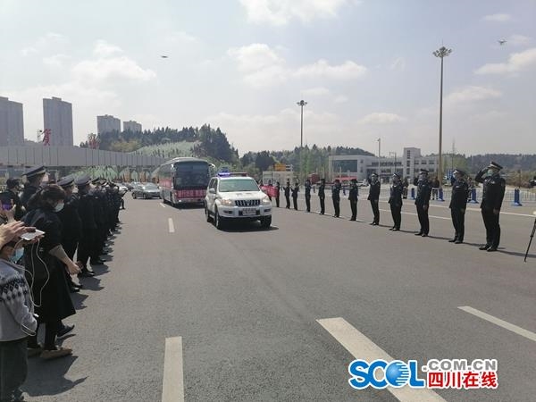 四川在线消息(严俊溢记者 吴忧)3月31日,资阳首批援湖北医疗队20名队员,返回家乡资阳。当天上午11时许,搭载医疗队的大巴车进入成渝高速资阳收费站,在数10辆交警铁骑的开道引领下,驶向资阳城区。