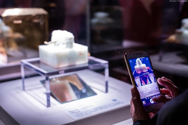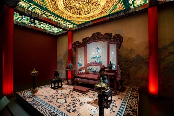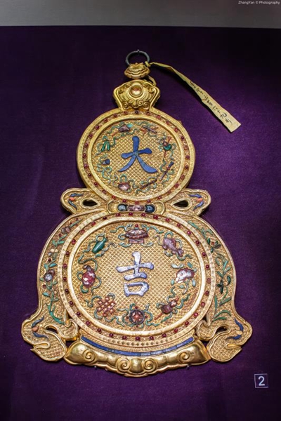“金玉琅琅”以来自故宫的多样珍宝,还原清代宫廷仪典与生活。大量场景复原、多媒体设备和投影,让观众仿佛置身于这些节日庆典的当时当地,感受华美而繁复的宫廷生活。在展厅中,观众可以看到乾隆皇帝的宝印“太上皇帝之宝”;在玉特磬与金镈钟奏响的钟磬之音里,围观那些曾寄托了宫廷中人平安愿望的佛教祭器和法器;看花样繁多的“寿”字拼接成皇子皇孙对长辈延年益寿的生日祝福;还有“囍”字如意上满刻的“长宜子孙”、“百子呈祥”等吉祥话语,与寻常百姓对新婚夫妇的寄语别无二致;“金瓯永固”杯里一注清亮的屠苏酒,满满的都是皇帝对国家安定,长治久安的新年祈望……这些以金玉制成的稀世珍品背后,不仅是帝后朴素的人生心愿,也是每一位观众心中对美好生活的愿景。