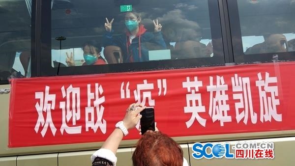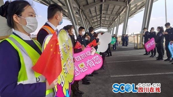 在成都双流国际机场,机场工作人员们也做好充分准备喜迎英雄凯旋,备好鲜花迎接他们的到来;打出“幸得一有您,山河无恙”、“英雄凯旋,感恩有你”等标语向他们致敬。