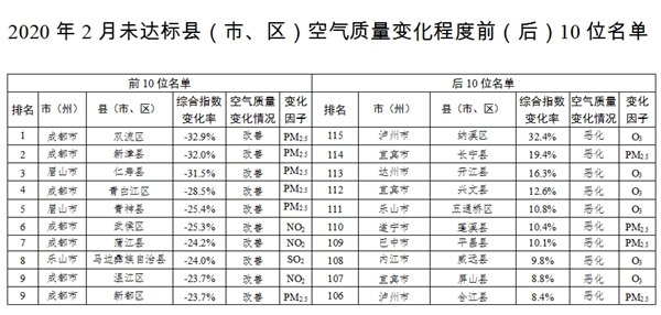 按照城市环境空气质量六项指标综合指数同比变化情况,2020年2月,未达标县(区)城市环境空气质量变化程度排名前10位的依次是成都市双流区、新津县、仁寿县、成都市青白江区、青神县、成都市武侯区、蒲江县、马边彝族自治县、成都市温江区和新都区(并列),均呈改善趋势。