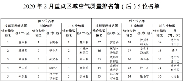 按照城市环境空气质量六项指标综合指数评价,2020年2月,成都平原地区环境空气质量排名前5位的依次是宝兴县、石棉县、荥经县、芦山县、平武县;川南地区环境空气质量排名前5位的依次是古蔺县、资中县、兴文县、筠连县、内江市市中区;川东北地区环境空气质量相对较好的排名前5位的依次是青川县、广元市朝天区、邻水县、南部县、剑阁县。