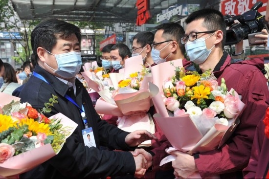 3月31日,成都市第二人民医院急诊科前,15名隔离观察期满14天的援助湖北医疗队队员凯旋归来。另有2名国家(四川)医学紧急救援队员也将随后归来。
