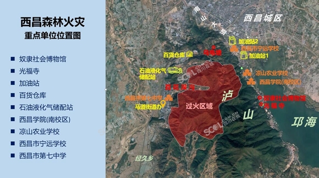 西昌泸山火灾情况危急,不同于一般的森林火灾,位于国家级风景名胜区,周边有众多重要设施,包括一处存量约250吨的石油液化气储配站、两处加油站、四所学校和奴隶社会博物馆、州级文物保护单位光福寺以及西昌最大的百货仓库。火势蔓延,必将会造成无法估量的次生灾害,科学扑救刻不容缓。火灾发生后,周边三个乡镇30分钟内紧急疏散1200余人,共计疏散18152人。特别是在3个小时内转移了石油液化气储配站高危区域3平方公里内的群众16000 人,酒店、民宿、学校等社会各界均纷纷自发设置群众临时安置点,可以说保卫泸山就是保卫西昌。