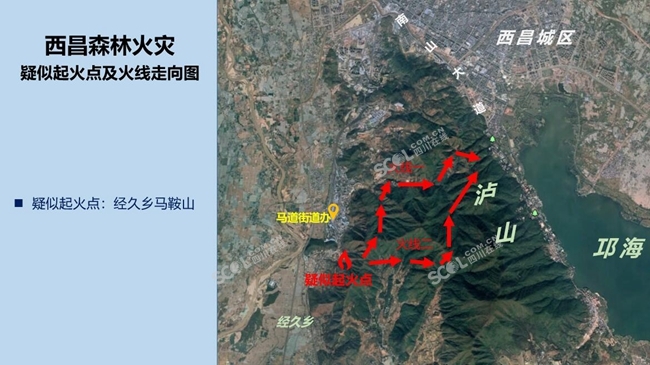 李俊介绍,3月以来,西昌进入千风季节,晴热天气异常,已连续20日无任何降雨,湿度仅为5%-10%。 特别是3月下旬以来已连续4天高温天气,30日最高气温达到31.2C,风力7-8级,本次起火点初步判定为大营农场柳树桩,沿经久、马道、泸山后山猛烈扩散,后因风向多变,火情扩散迅速,并伴多处飞火,造成多处多线速燃态势。