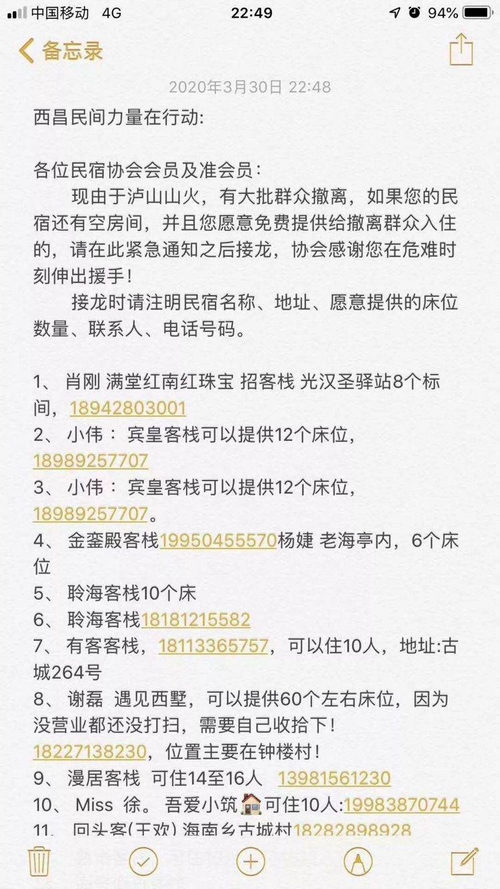 西昌市旅游局、西昌市民宿协会分别发起倡议,呼吁有空房间的民宿允许撤离群众免费入住。几小时内,数十家民宿响应,包括一些大型酒店。