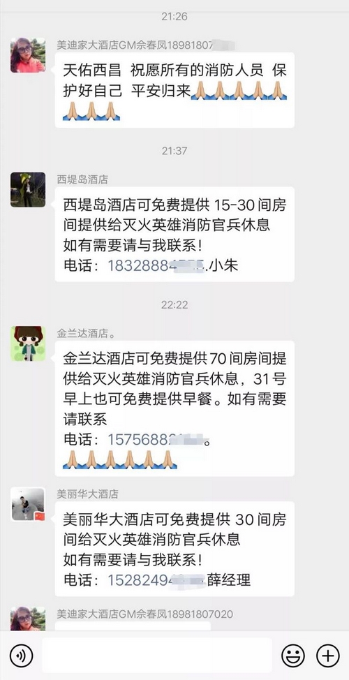 西昌市旅游局相关工作人员透露,西昌本来就是旅游城市,有着丰富的酒店民宿资源,此次倡议一呼百应已得到约100家酒店民宿的响应。西昌市民宿协会工作人员陈笑羽介绍,接下来还为一线灭火救援消防官兵、志愿者提供1000张免费休息床位。