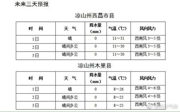 从凉山州气象局发布的最新天气预报看,今晚到明天,天公仍不作美,全州大部地区晴间多云。据目前的气象资料分析,出现降雨的最近时间,冕宁县是4月4日,西昌市和木里县在4月5日。
