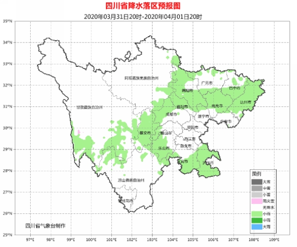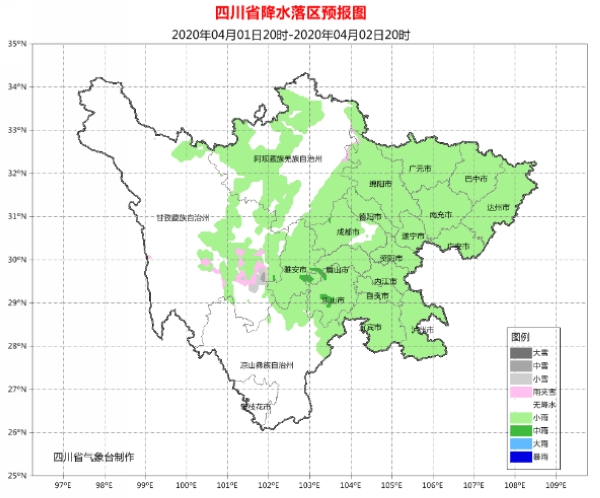 4月1日晚上到2日白天:盆地各市阴天有小雨,其中雅安、眉山、乐山3市局部有中雨;甘孜州东部、阿坝州和凉山州东北部多云间阴有阵雨(雪),甘孜州和攀西地区的其余地方晴间多云。