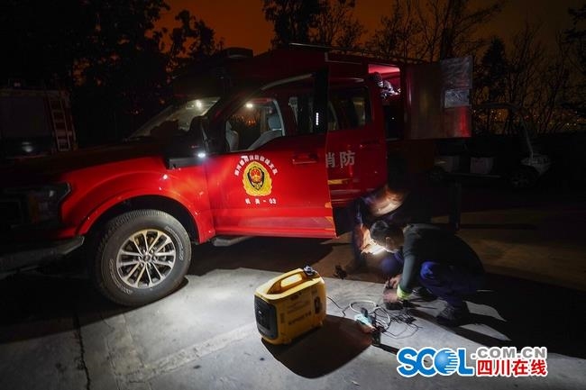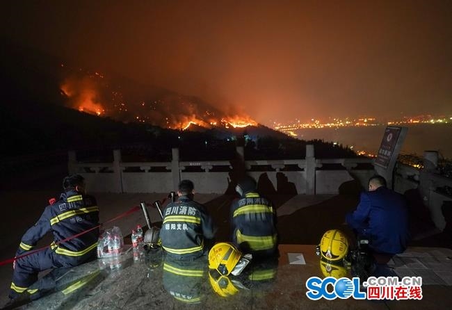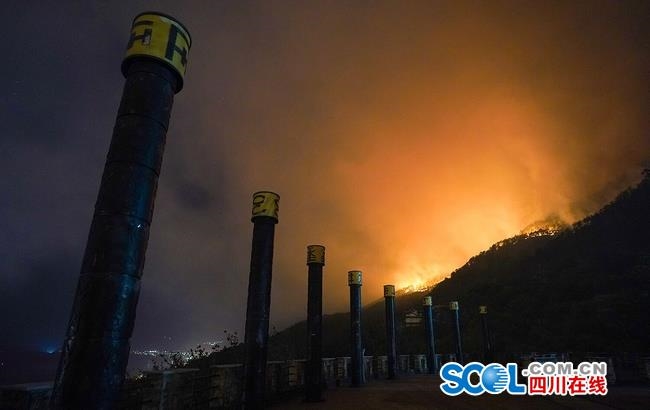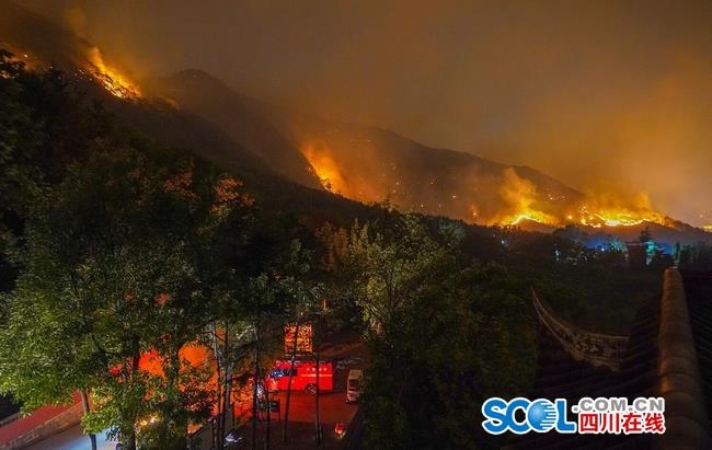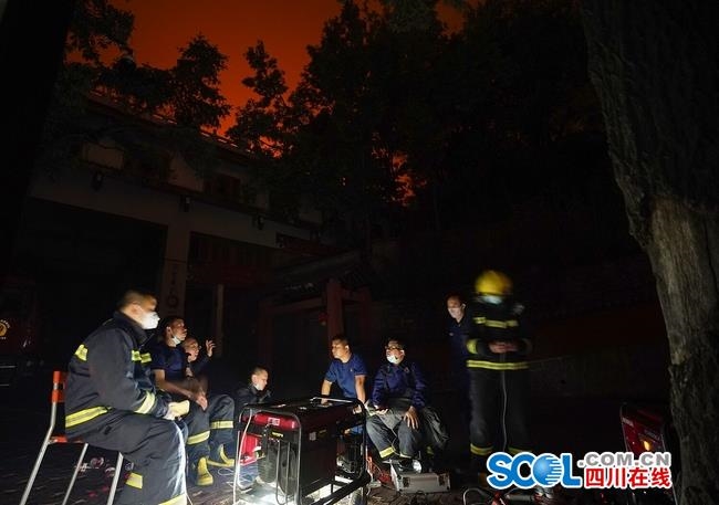 在光福寺,背后泸山上的火光把天空映照得通红。来自成都、德阳、凉山等三地的30余名消防人员在光福寺现场通宵值守,时刻关注着火情进展。据现场消防人员介绍,火线距光福寺大殿有400余米的距离,为保护寺庙安全,消防人员现场布置了3道防线,接通了寺庙内12处消防供水通道,同时,多辆消防车及市政供水车在现场值守。