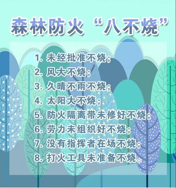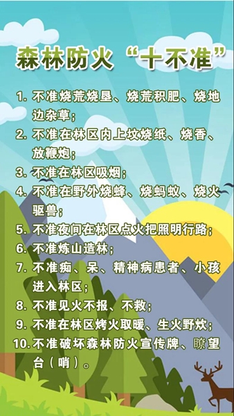 目前正值春耕备耕时期,清明节将至,林缘劳作、入林春游、祭祖扫墓等活动大量增加,森林防火形势日趋严峻。请记住森林防火“十不准”“八不烧”,共同维护森林安全。