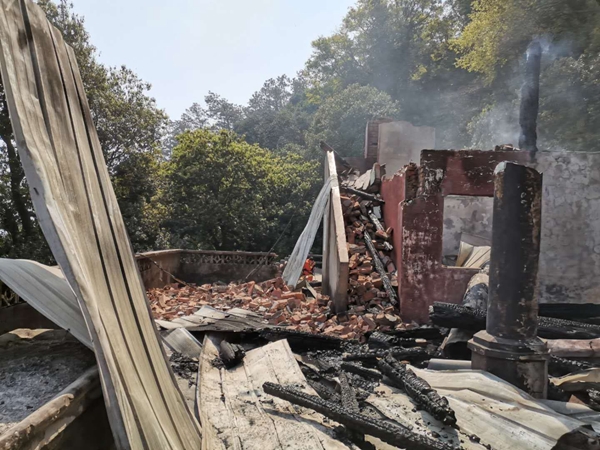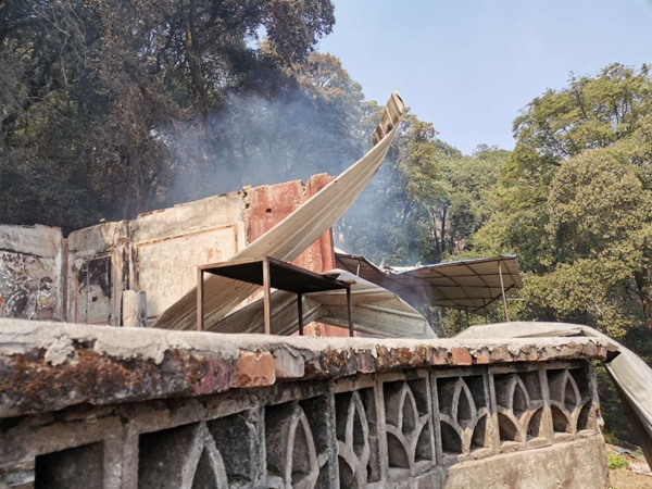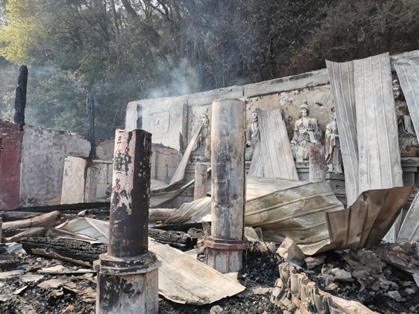 五祖庵重建于上世纪80年代,为泸山9处宗教场所的最高点,其建筑面积共有1800余平方米,多为土木结构建筑。工作组现场发现,五祖庵的主殿、客房以及公共附属设施均被山火烧毁,仅有一个旅游厕所和砖混结构的库房完好。目前,五祖庵的所有火点已被扑灭,泸山9处宗教场所均有消防人员现场值守。(受访人员供图)