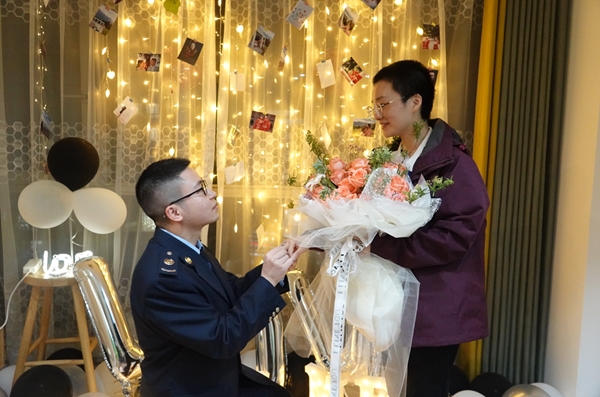 四川在线消息(袁爱平 周雅 记者 魏冯)“自2017年9月3日相识至今,我们走过两年又210天,未来的路还很长,从今以后,你保护别人,我保护你,嫁给我吧!”3月31日晚,泸州市古蔺县援鄂护士杨莉胜利凯旋,在俩人为婚礼准备的新房里,未婚夫袁骁手捧鲜花、戒指,在亲朋好友的见证下单膝下跪向其求婚。
