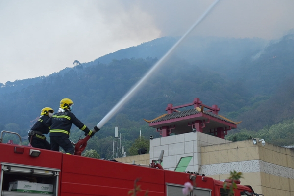在西昌学院,着火点的位置距离消防指战员驻守点的直线距离不到1000米,如果山火继续向下蔓延,将危及学校及城镇。驻守在西昌学院民族预科教育学院点的眉山支队消防指战员迅速出动,制定阻截方案,设置水枪阵地。同时,防止火星引燃山下的枯草枯枝,消防指战员利用水枪对周边的树木进行喷淋,提高湿度,防止山火危及到学校及周边房屋。
