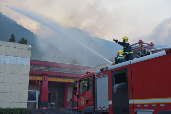 4月1日凌晨,凉山西昌泸山正面有多处火点持续燃烧。在光福寺,背后泸山上的火光把天空映照得通红。按照四川省消防救援总队的统一调度部署,来自成都、德阳、凉山等三地的30余名消防人员在光福寺现场通宵值守,时刻关注着火情进展。现场指挥的总队长现场查看火势发展趋势,组织成都支队作战力量在光福寺大殿前增设水枪阵地,现场确认安全范围,并测试水枪出水距离,做好阻止火势蔓延至大殿的准备。据现场消防人员介绍,火线距光福寺大殿有400余米的距离,为保护寺庙安全,消防人员现场布置了3道防线,接通了寺庙内12处消防供水通道,并持续出水将附近树木植被打湿,将火线阻断在了安全距离之外。