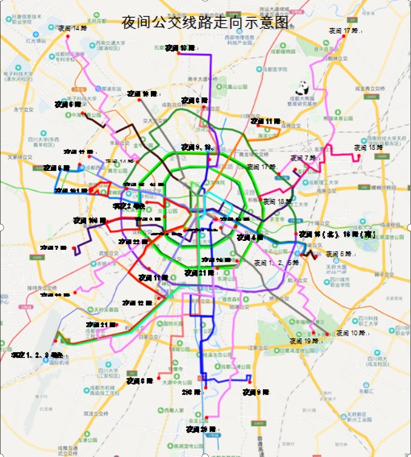 随着这些夜行线路开通以来,成都公交结合成都市商圈及道路布局特点,不断实现核心商圈与主要客运走廊以及走廊之间交汇节点、高密度住宅区之间的有效连接,提升居民集中区与大型商圈、交通枢纽、写字楼、医院、工业园区等大型场所的有效接驳,形成“环+放射”形状夜间公交服务网络。截至2019年底,成都市夜间公交线路开行总数达28条,总均班次200班,日均客流达1万人次。