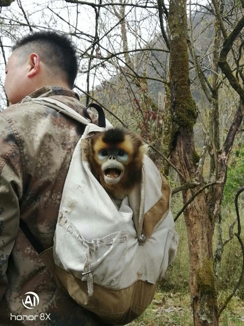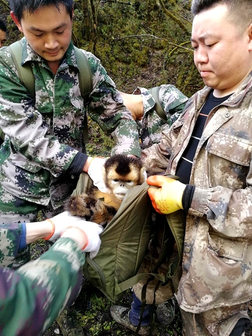 巡护人员立即对金丝猴周围进行仔细巡护,未发现有其它金丝猴猴群活动,为了保证安全,巡护人员故意发出响动,试探金丝猴的反应,但该金丝猴发现巡护人员后,只是注视着巡护人员,仍然爬在树窝下并未主动躲避,初步判断可能是受伤或生病。于是巡护人员决定对其捕捉,随后检查了金丝猴身体,通过检查金丝猴全身无外伤,初步判断是生病或是饥饿导致身体虚弱未跟上猴群而落单,如不实施救护,该金丝猴在无法得到猴群的庇护下,将很快因病和饥饿死亡,巡护人员决定实施救护,随即将捕捉的金丝猴护送回保护站并报告保护科。