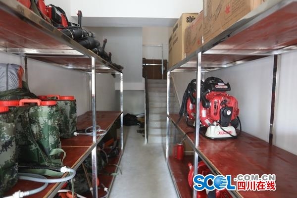 ▲位于一楼的装备库房,空出来的位置,就是去西昌扑火的队员带走的装备。