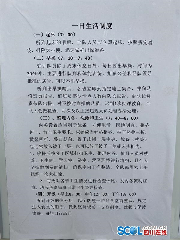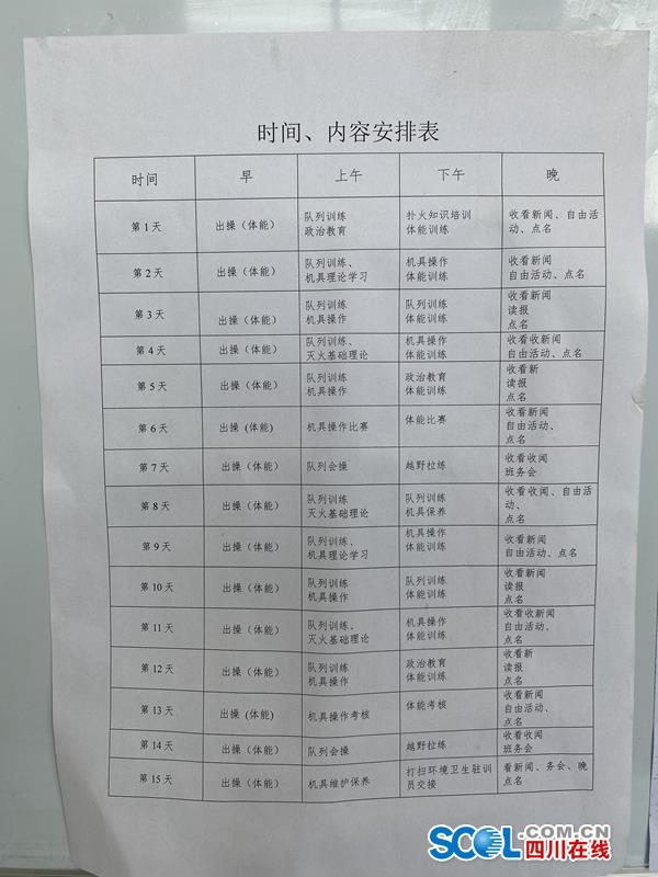 ▲队员的集训课程表。扑火队共分为8个班,每班10名队员。采用轮训制,每次两个班入驻集中培训,共15天。