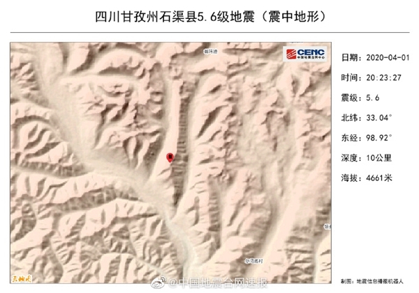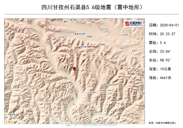 据中国地震台网正式测定:4月01日20时23分在四川甘孜州石渠县(北纬33.04度,东经98.92度)发生5.6级地震,震源深度10千米。