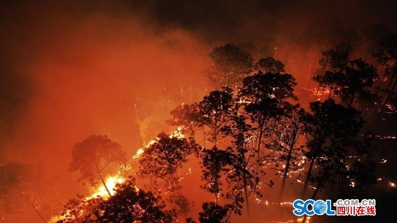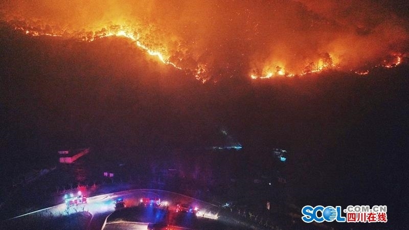 四川在线消息(记者 王云 袁敏 现场报道)4月1日晚,受风力影响,西昌泸山山火复燃。