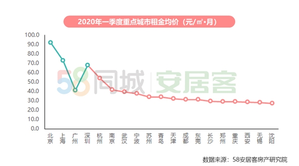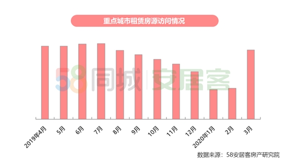 58同城、安居客《2020年一季度楼市总结》报告数据显示,一季度租房市场供应总量同比去年下降36.5%,2月租赁房源供应量下跌,3月出现明显回升,环比2月上涨1.04倍。但不同级别的城市,其租赁房源供应量、供应面积段以及访问量等方面呈现出较大的差异。