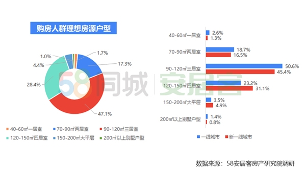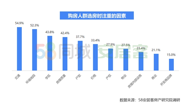 这些购房者依然更青睐三居室,58同城、安居客调研中有47.1%的人群选择90-120㎡三居室。另有28.4%的调研人群选择了120-150㎡四居室。房源总价多集中在100-200万,其中选择100-150万的人群占比25.3%,倾向于150-200万价格段的人群占比19.9%。同时,购房者对房屋周边的交通、环境地段相对更为关注,选择这两项的调研人群占比均超过五成;此外,小区对应的学区也是近期购房者关注的主要因素之一。室内空间层面,购房者对于主卧、客厅更为关注,人群占比均超过50%。
