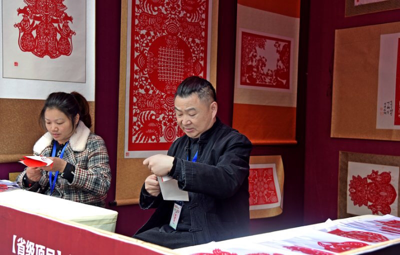 “仪陇剪纸源远流长,蕴藏着古老的文化内涵,具有朴实自然的艺术特色。过去,仪陇剪纸多见于喜笺和刺绣,同时,它和仪陇皮影、蓝印、民歌紧密结合,互生互长,并行发展。仪陇剪纸既不同于北方剪纸的大刀阔斧,也不同于南方剪纸的精雕细刻,而是粗中有细、细中有粗。1995年被国家命名为“中国民间艺术之乡(剪纸)”,2009被列为四川省第二批非物质文化遗产名录项目。”何小锵不时向围观的市民讲解仪陇剪纸文化知识。有的市民还表示要向何老师学习剪纸。