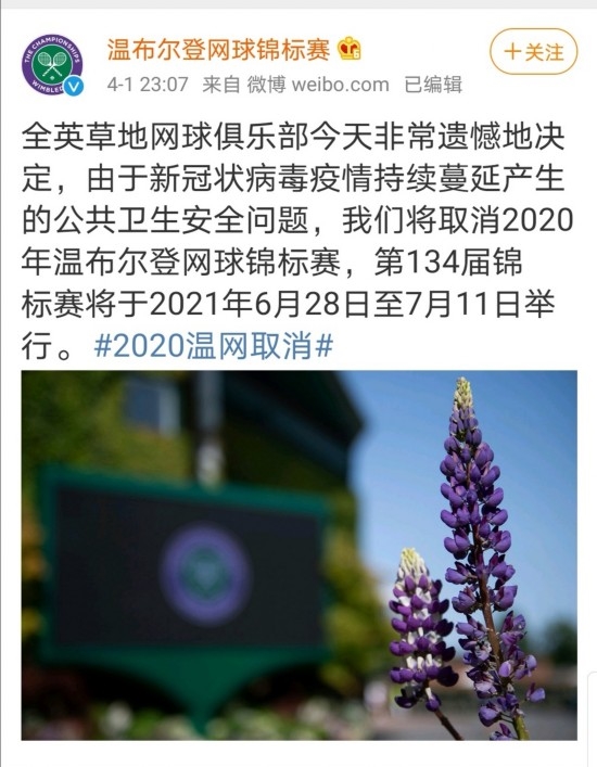 4月2日,温布尔登网球锦标赛官方宣布,2020年温网比赛因新冠肺炎疫情取消,第134届锦标赛将于2021年6月28日至7月11日举行。