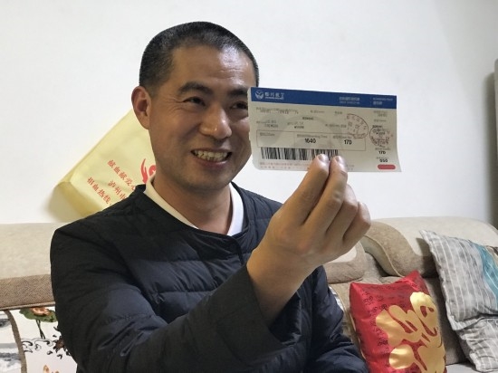 李国华拿出了返程机票,留作纪念。黄平摄。