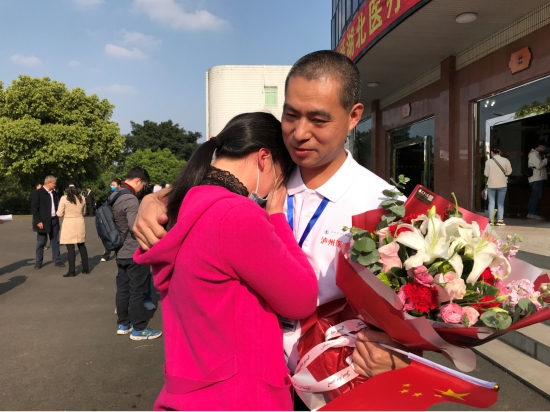迎接医疗队归来,袁盛琼很紧张,在等待区不停地走动、张望,由于迎接家人归来的人多,袁盛琼生怕错过了和丈夫的碰面。终于,满载着20名医护人员车辆缓缓驶入,举行了迎接仪式后,他的丈夫从人群中径直走来,夫妻二人都抑制不住内心的激动,久久拥抱。
