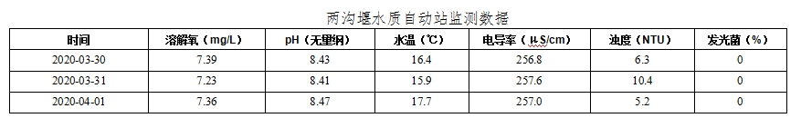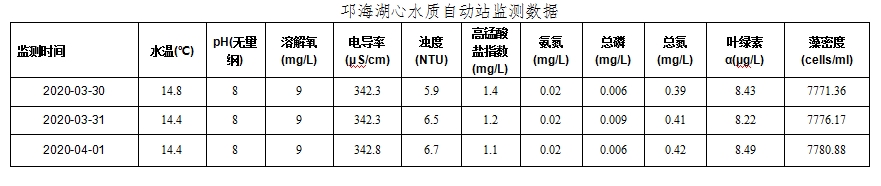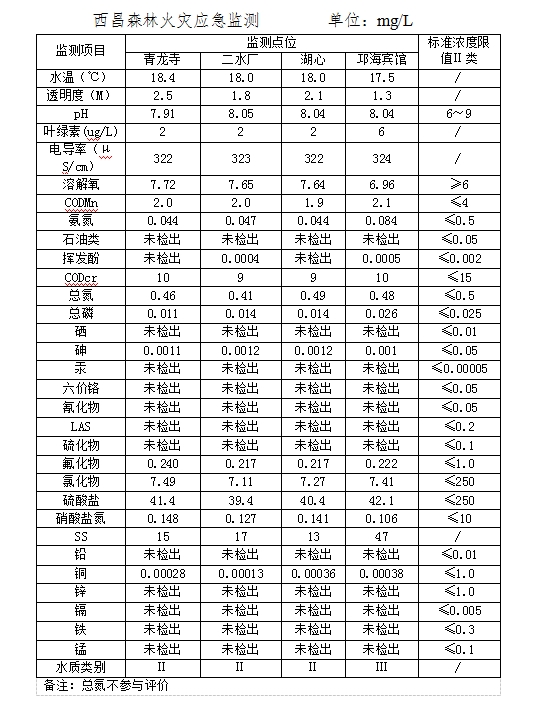 4月1日,州、市环境监测站联合对邛海水质开展应急监测,监测结果显示:青龙寺、二水厂、湖心监测断面水质优,类别为Ⅱ类;邛海宾馆断面水质良好,类别为Ⅲ类。