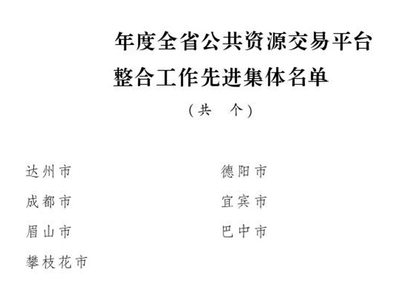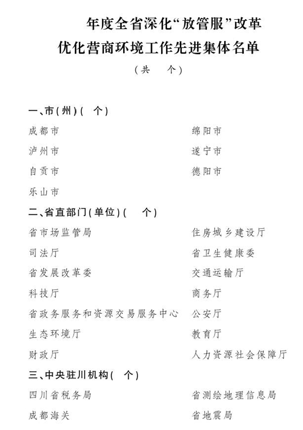 近日,省政府办公厅发文,表彰2019年持续推进简政放权、放管结合、优化服务,加快推进政府职能转变,在深化“放管服”改革优化营商环境工作中做出积极贡献的先进集体。经省政府同意,决定对成都市等25个全省深化“放管服”改革优化营商环境工作先进集体、达州市等7个全省公共资源交易平台整合工作先进集体、省卫生健康委等15个省政务服务大厅先进窗口单位予以通报表扬。