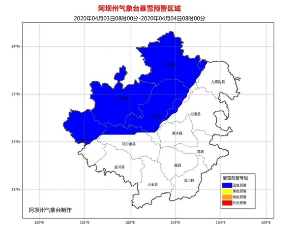 4月3日,阿坝州气象台发布暴雪蓝色预警。