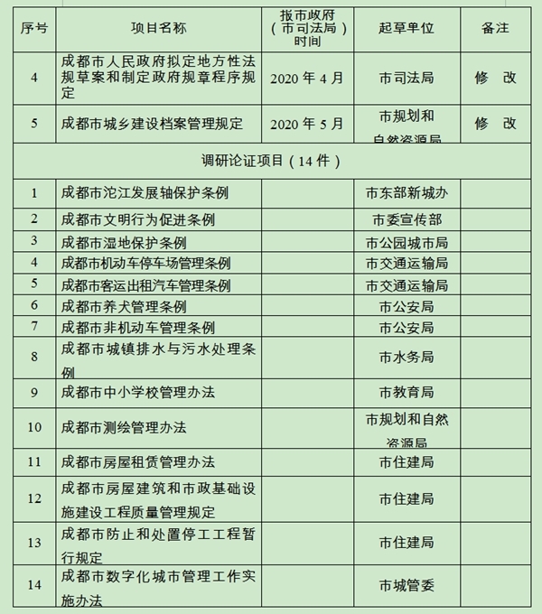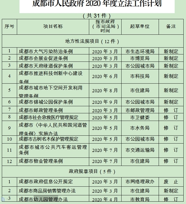 4月3日,记者从成都市人民政府网站获悉,成都市人民政府2020年度立法工作计划已经出炉。今年的立法计划中共有31件项目,其中地方性法规项目12件,政府规章项目5件、调研论证项目14件。