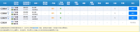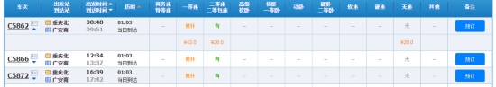 4月5日,广安南到重庆北动车班次截图。