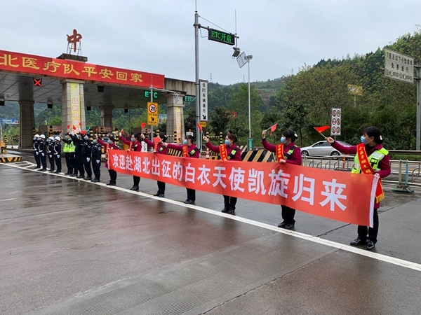 “回家,与家人团聚”是所有队员们的心声。当搭载着10名援湖北医疗队员的专车出现在巴中高速路口时,巴中已准备好了向他们致以崇高的敬意。在巴中西收费站,民警们列队敬礼,11辆警用摩托和2辆警车,一路护送英雄们进城。市民们也自发来到人民广场,举着写有“英雄凯旋 欢迎回家”的标牌,迎接抗疫英雄凯旋。
