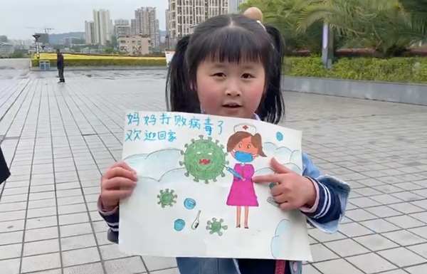 和妈妈分别50天,小姑娘特意给妈妈准备了一份礼物,是一幅水彩画,画上是戴着口罩的妈妈正在跟病毒作战。“每天都很想念妈妈,现在妈妈把病毒打败了。”小姑娘腼腆地说道。
