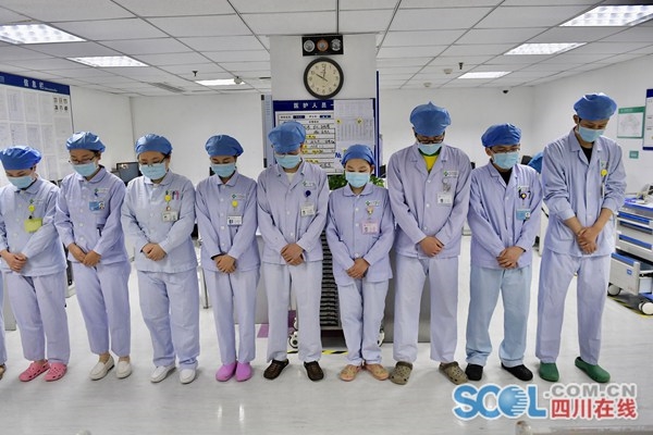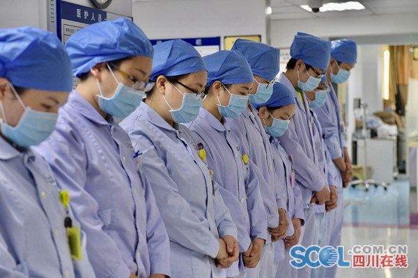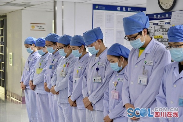 四川在线消息(记者 郝飞)4月4日10时,全国人民默哀3分钟,汽车、火车、舰船鸣笛,防空警报鸣响,表达全国各族人民对抗击新冠肺炎疫情斗争牺牲烈士和逝世同胞的深切哀悼。在一线的四川省人民医院外科监护室的医护人员默哀三分钟,深切哀悼烈士和逝世同胞。