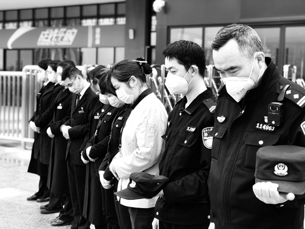兴隆场编组站上空,8台调车机汽笛声齐鸣,一线工作人员摘下帽子,向抗疫牺牲的英雄和逝世的同胞致敬。