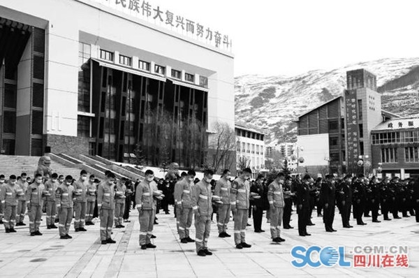 4月4日10时,海拔4860米的达古冰川景区山顶处,白雪皑皑,鲜红的五星红旗降下半旗。10余名景区管理局干部身着厚厚的棉衣,佩戴口罩,排成队聚集在一起,默默祈祷,静静哀思3分钟,表达对抗击新冠肺炎疫情斗争牺牲烈士和逝世同胞的深切缅怀。