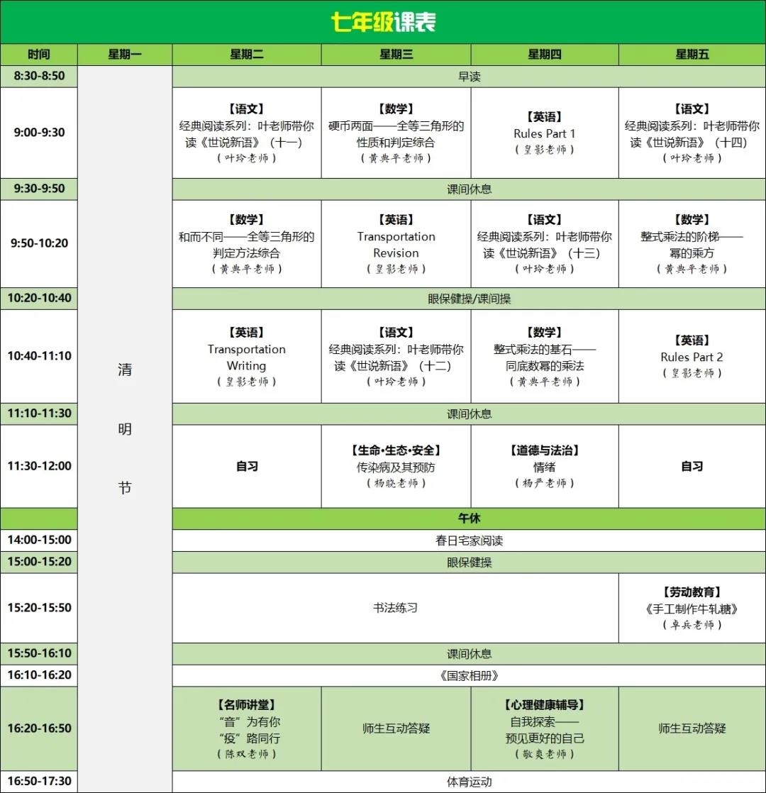 1.以上课表供我省疫情防控延期开学期间七年级、八年级使用。学科教学、国家相册、名师讲堂等相关课程资源通过有线电视、IPTV、网络平台进行推送。