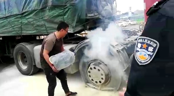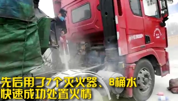 值班民警夏永松带领辅警拎起灭火器迅速赶往现场,边放置锥形桶、疏导交通,边灭火。先后用了7个灭火器将明火扑灭,又从检查站接水8桶持续对起火的轮胎、牵引车头以及紧邻的油箱降温,以防复燃造成恶劣影响。随后,移交赶到的路政工作人员处理。