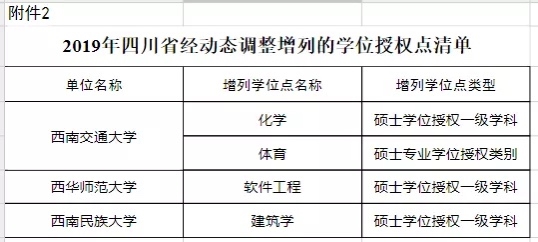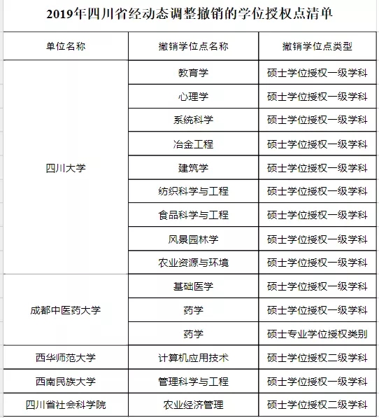 其中,2019年四川省经动态调整撤销的学位授权点15个、增列的学位授权点4个。(详细名单如下)