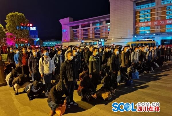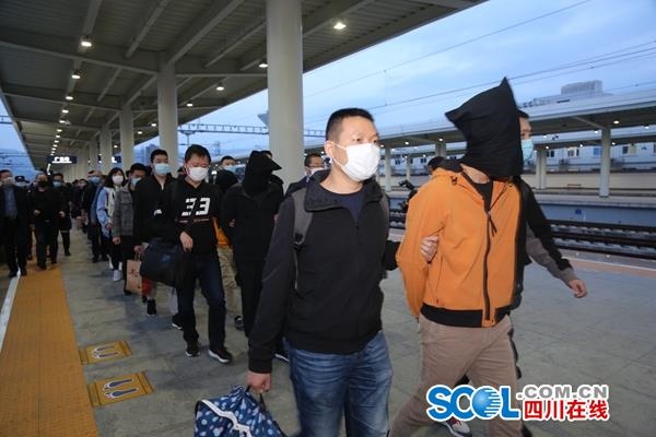 四川在线消息(高志农 记者 燕巧)4月6日晚7时12分,随着广州至广元的D1852次列车驶入广元火车站,“12.13”特大电信网络诈骗案的38名犯罪嫌疑人在近90名公安干警的押解下,走出广元站。24分钟后,从广西南宁开来的G2856次列车抵达广元站,该案的另外16名犯罪嫌疑人也被押解出站。