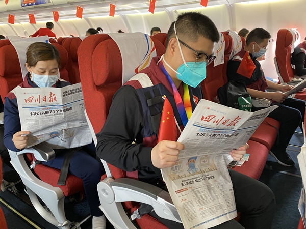 四川在线消息(记者 黄大海)4月7日下午1点40分许,武汉天河国际机场内,川航3U3104次航班开始滑行,准备起飞。在这架搭载着四川162名医护人员的航班上,四川日报为每一位英雄都准备了一份特殊礼物:当天,四川日报推出两个连版特刊,记录下1463名逆行天使为生命续航的壮举,这份报纸将送到每一位四川援助湖北医疗队队员手中。
