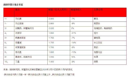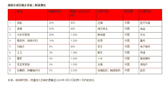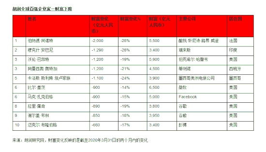 胡润研究院4月6日发布《疫情两个月后全球企业家财富变化特别报告》,研究了胡润全球富豪榜上的企业家在截至2020年3月31日的两个月内的财富变化,公布了最新的《胡润全球百强企业家》榜单。