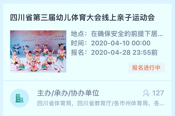 为深入贯彻《体育强国建设纲要》,大力实施四川体育发展“123456”战略部署,着力推进四川省幼儿体育健康发展,积极引导广大幼儿家庭重视体育锻炼,从小培养幼儿体育兴趣,提高幼儿身体素质和抵抗力、免疫力,促进幼儿身心健康快乐成长,4月7日,“四川省第三届幼儿体育大会线上亲子运动会”拉开大幕,全省21个市州的所有适龄儿童以及家庭都能够参加这次“线上亲子运动会”,并赢取丰富奖励。