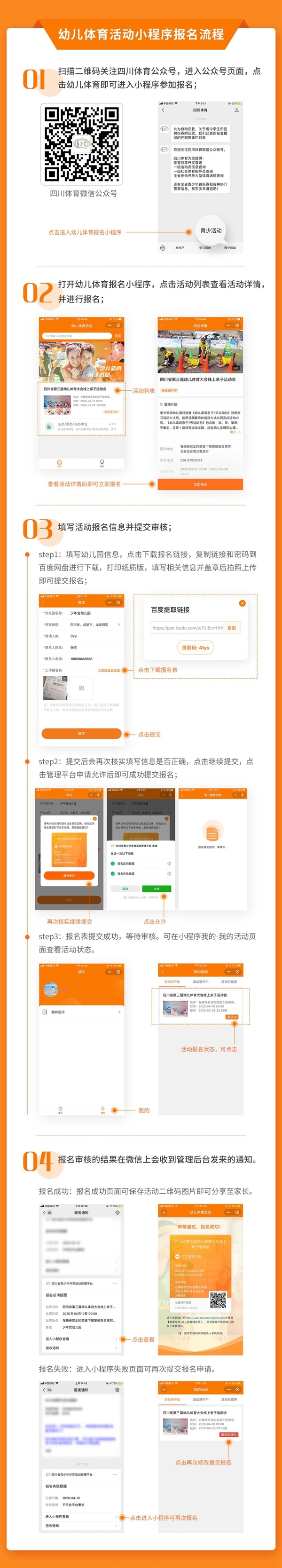 幼儿园报名操作流程为:关注“四川体育”官方微信号——点击青少活动——点击四川省第三届幼儿体育大会线上亲子运动会——点击立即报名——按提示填写幼儿园信息提交(同时上传盖章报名表)——审核通过将收到“服务通知”提示报名成功——点击提示信息获取专属二维码。