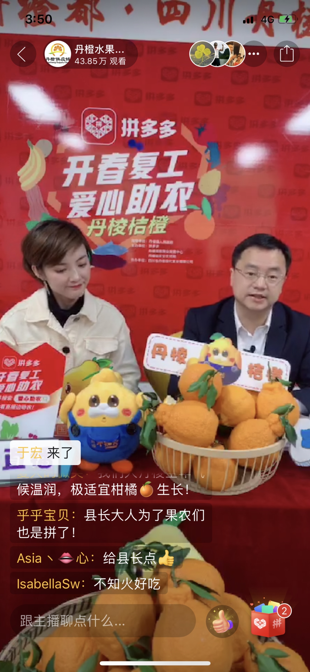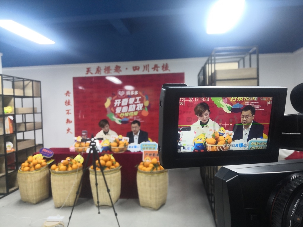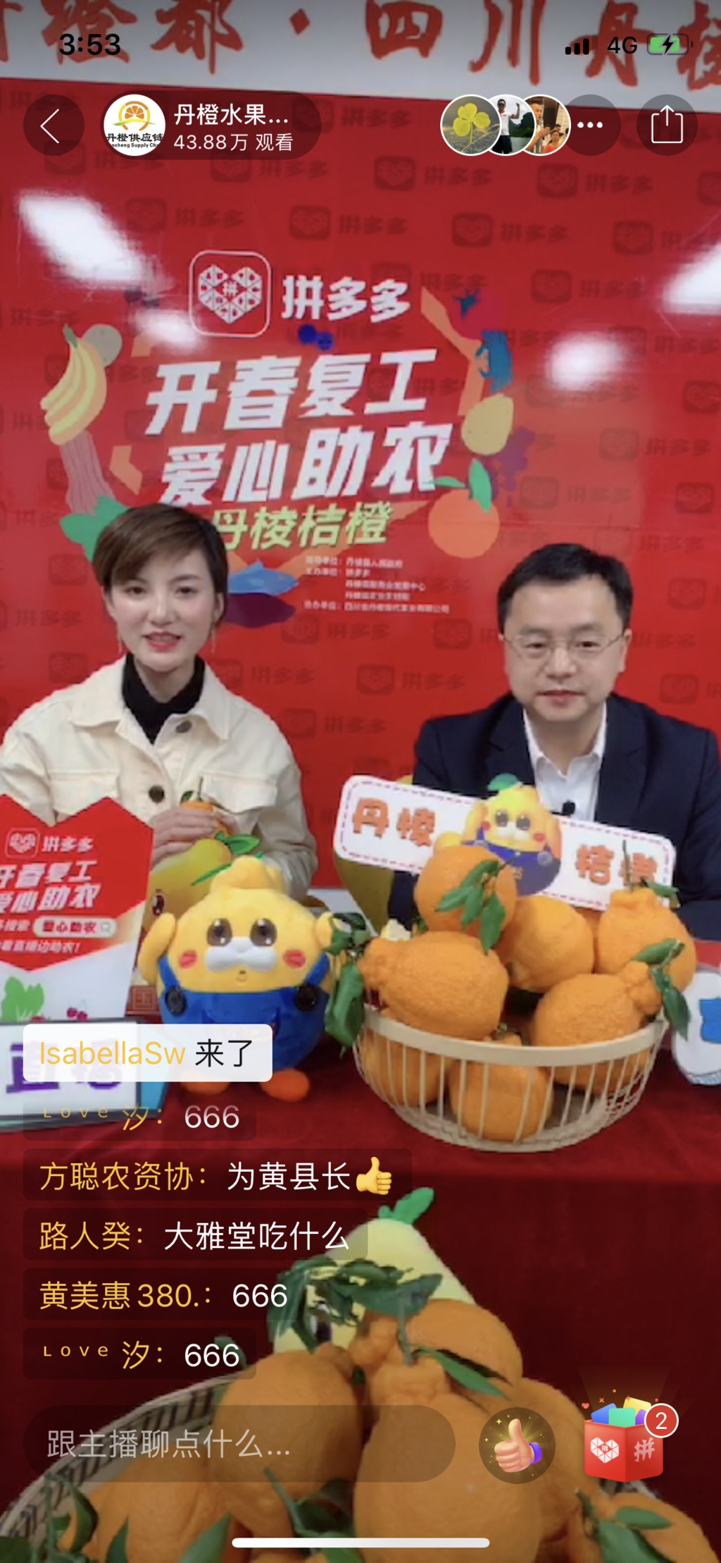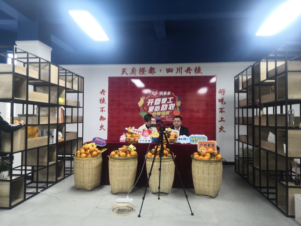 4月7日15时40分,丹棱县四川省丹橙现代果业有限公司二楼一产品展示间改造的直播室内,面对拼多多平台数十万在线网友,丹棱县县长黄秀航抛出了丹棱不知火的网络宣传口号,为全县八万果农代言,卖柑橘。